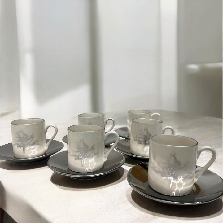SET DE TAZAS DE PORCELANA CON DISEÑO ÁRBOL Y BORDES PLATEADOS